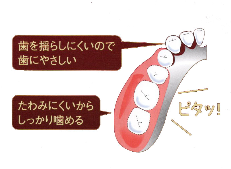 通常の義歯は残った歯や健全な歯にバネをかけて、はずれないように調節するのですが、このバネの横揺れの力が歯にとってはあまり良くないのです。(歯科医も強すぎないよう弱くてはずれないよう調節しますが。)バネのかかる歯に対して噛む力が集中し、ねじれの力がテコの原理のように健康な歯に加わります。その結果、せっかく残っている健康な歯も痛み、結果として「全ての歯を失うリスクが高い治療法」です。